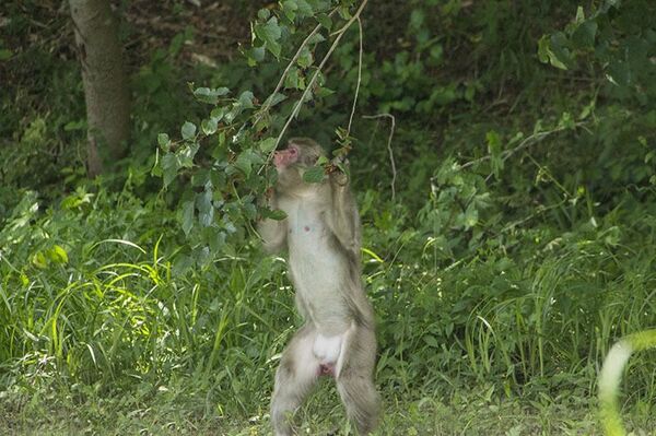 人家近くの農地に灰色の塊が転がっているなと思ったらサルだった。小さな陽だまりの中で日向ぼっこをしながら毛づくろいをしていた。その後ろの林の中には群れがいるらし