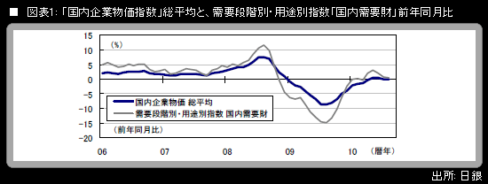 国内品と輸入品の双方を含む企業段階の物価の全体像を見るために、需要段階別・用途別指数に注目すると、国内需要財は今回、前月比▲0.3%。前年同月比は+0.4%で、プラス幅は前月確報の同+0.8%から縮小した。