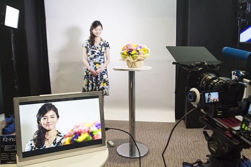 カメラの先には、女性のモデルがいて、カメラとその女性の間には花瓶に生けられた花がある。そのカメラはHDMIケーブルでFZ-Y1CHとつながっている。デモンストレーターがカメラを操作してFZ-Y1CHの画面で確認しながらピントを女性に合わせたり、花に合わせたりしている。表示のタイムラグは感じられない。拡大縮小も実に自然に行われている。