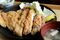 大きな鳥ムネ肉を1枚丸ごとを揚げ、キャベツと一緒に食べる「山賊焼」(長野県松本市で撮影)