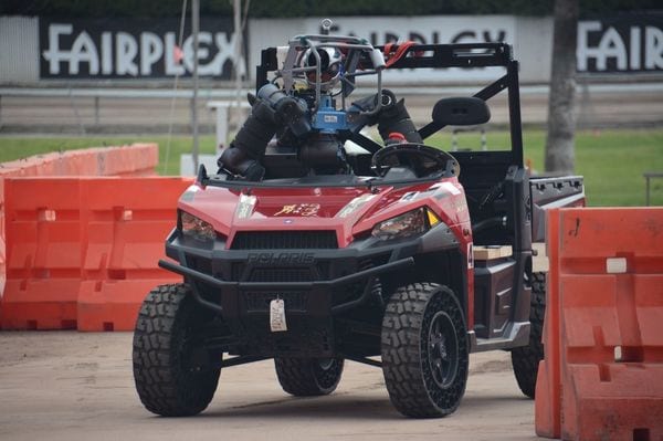 「DARPA 災害対応ロボットコンテスト」の様子。自律式ロボットによる自動車操縦も競技対象となった。(出典:DARPA)
