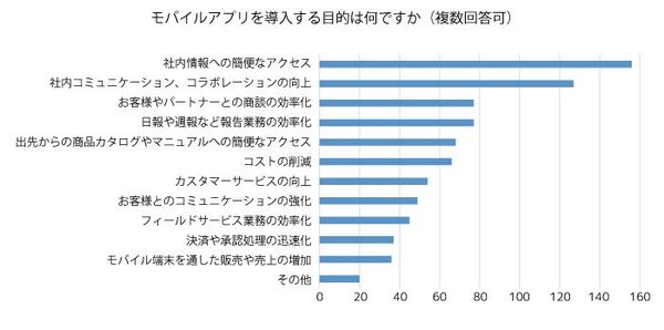 ユーザーがモバイル業務アプリに求めるものは具体的に何なのか。「モバイルアプリを導入する目的は何ですか(複数回答可)」との設問に対し、「社内情報への簡便なアクセス」「社内コミュニケーション、コラボレーションの向上」「日報や週報など報告業務の効率化」「お客様やパートナーとの商談の効率化」といった回答が上位となった。総じて、日々の業務における効率を向上させスピードアップを図りたい、といった回答と言えるだろう。