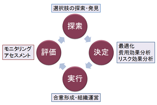 下の図は組織における意思決定のプロセスを概念化したものである。何らかの課題を解決する上では、選択肢(対策案や事業案)を設定する必要がある。複数の有力な選択肢がある場合には、それぞれのコストやリスクとベネフィットを比較し、最適な選択肢を選ぶ。この段階で責任者が決裁を行い、対策や事業が実行される。その実行過程で生じた問題をチェックし、想定外の問題が生じた場合には選択肢を修正する。