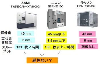 ここで、各露光装置メーカーの最先端露光装置(ArF液浸)のカタログスペックを比較してみよう(図3)。スループットに注目すると、キヤノンは不明だが、ASMLとニコンのスループットは、数値的には、ほぼ等しい。