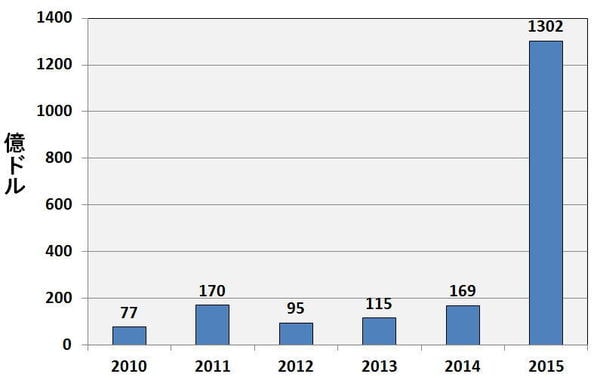 そしてこの大型M&Aの波が、半導体製造装置業界にも到来したわけだ。2010年以降の半導体業界におけるM&Aの規模の推移を見てみると、2015年は10月22日時点で既に1302億ドルに達した(図1)。