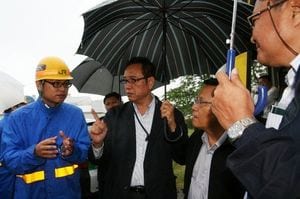 激しい雨の中、踏切脇で秋田信号通信技術センターの職員(左)に熱心に質問をする
