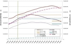 図1 燃料油販売と自動車保有台数の動向。国の目標に合わせて、ガソリン、軽油それぞれの1990年販売量を基に、その25%減のラインも入れてみた。ガソリンの消費量は、現状の半分まで減らさないとこの目標には到達できない。一人ひとりが走る距離を減らさないとすれば、それぞれに実用燃費を倍にしなければならないわけだ。拡大画像表示