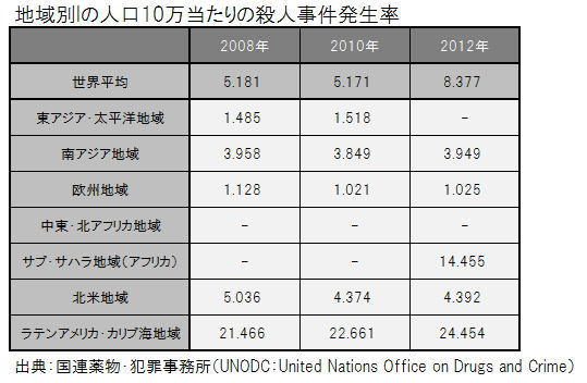 例えば、国連薬物・犯罪事務所(UNODC:United Nations Office on Drugs and Crime)の人口10万人あたりの殺人事件発生率は、国別の治安状況を概観する上で貴重な資料である。