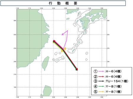 この航空機編隊を形成していたのは、轟炸6K型(H-6K)ミサイル爆撃機8機、空警200型(KJ-200)早期警戒機1機、運輸8電偵型(Y-8DZ)電子情報収集機1機、ツポレフ154M型(TU-154M)情報収集機1機であった。