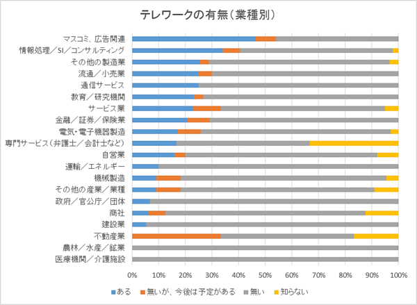 「マスコミ、広告関連」「情報処理/SI/コンサルティング」という業種ではテレワーク採用が進んでいる。テレワークでの業務遂行が難しい業種もあるため、一概に採用が進んでいる業種、進んでいない業種という切り分けはできないが、柔軟な勤務形態が増えていけば、介護や育児のために退職してしまうビジネスパーソンの減少につながるのではないだろうか。