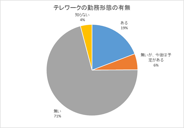 「ワーク・ライフ・バランスの向上には、通勤時間や外出に伴う移動時間が削減できる、テレワーク(在宅勤務、モバイルワーク、サテライトオフィスでの勤務)が有効ですが、あなたの会社にはテレワークの勤務形態がありますか?」という設問に対し、「ある」という回答が19% 、「今後は予定がある」が6%となった。オフィスにとらわれない“テレワーク”という柔軟な勤務形態が、ワーク・ライフ・バランスの向上に寄与するのか、以下で掘り下げていこう。