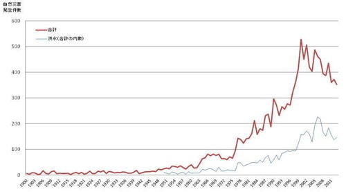 図1は、国連国際防災戦略事務局(UNISDR)が運営する世界的な自然災害のデータベースであるEM-DATから抜粋した「1900年以降の自然災害の発生件数」である。このグラフからは、1970年代以降、急激に自然災害が増加していることが分かる。