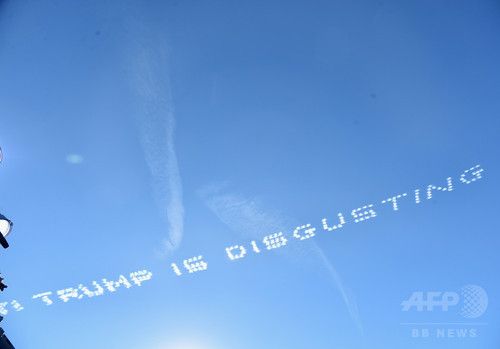 カリフォルニア州パサデナで開催されたローズ・パレードで、上空にスカイライティングで描かれた「Trump is disgusting(トランプにはむかつく)」の文字〔AFPBB News〕