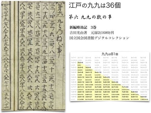 その中に江戸の九九が載っています。現在、日本では1×1=1から9×9=81まで81通りの九九を習います。