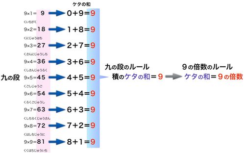 右辺の積にある"事実"――。どれもケタの和が9であることに気づくでしょう。この事実を両手を用いた方法に表現し直したということです。