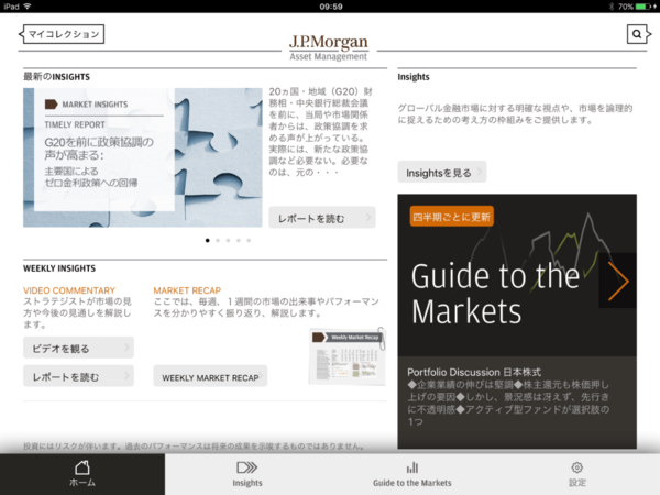 J.P.モルガンとしての見解をお伝えするという目的もInsightsアプリにはあり、たとえばホーム画面左下の「WEEKLY INSIGHTS」のコーナーでは、ストラテジストがその時々の旬なテーマに沿って、市場の見方や今後の見通しを解説しています。
