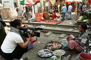 マンダレー駅にほど近い市場の一角。線路脇で女性が魚を売っていた