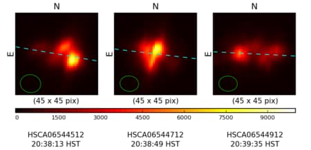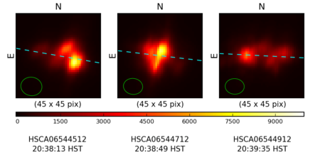 地上のすばる望遠鏡で撮像した軌道上のひとみ。約40秒間隔で3枚撮像。ひとみが回転しているため、角度と形が変化して見える(姿勢が安定しているなら、全て同じ姿に見えるはず)。(JAXA [ http://fanfun.jaxa.jp/jaxatv/files/20160415_hitomi.pdf ]から。国立天文台の画像をJAXAが提供)