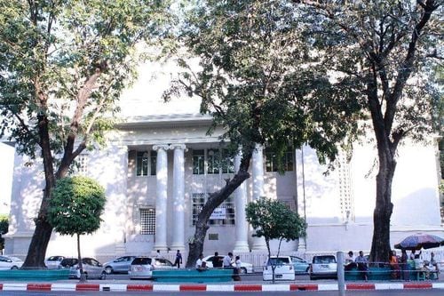 4本の柱が印象的なヤンゴン証券取引所の外観