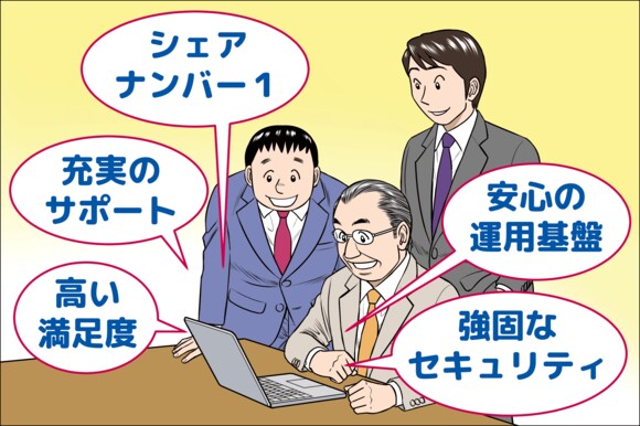 部下1 なるほど、安心の運用基盤、強固なセキュリティ・・顧客満足度も第1位です!機能や導入の容易さの他、信頼性や問い合わせ対応でポイントが高いようなので、サポートもしっかりしているのでしょう。