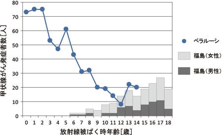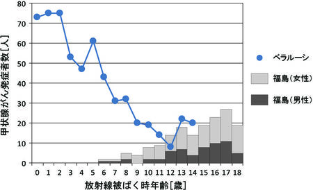 図7. チェルノブイリ事故後1987~97年の間にベラルーシで見つかった甲状腺がん発症者数の年齢分布(被ばく時年齢14歳以下のみのデータ・文献*47)と福島県民健康調査によって見つかったものの比較。福島の分布は文献*6の図3と、文献*7の図3を足し合わせて作図。福島において、被ばく時年齢5歳以下の乳幼児から甲状腺がんの発症は見られていない。拡大画像表示