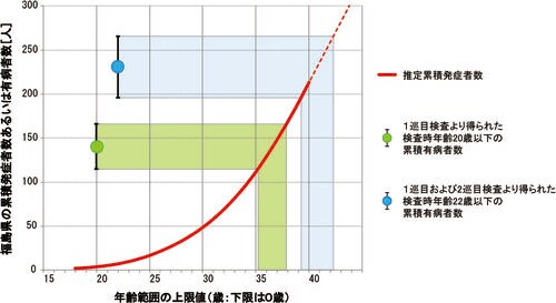 図4. 福島県(2010年人口統計)における、生誕後各年齢までに甲状腺がんを発症したことのある累積患者数の推計。赤い曲線で示す各年齢以下の推定累積発症者数は、文献*13のデータを使用。文献*13では計算されていなかった40歳以上範囲は直線で外挿した。/緑の●は、1巡目検査より得られた検査時20歳以下の累積有病者数。青の●は、1巡目および2巡目検査より得られた検査時22歳以下の累積有病者数(累積有病者数の数値については表1参照)。拡大画像表示