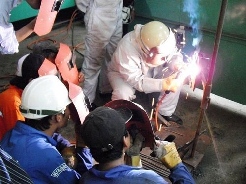 手溶接の方法を実地指導する日本人技術者(=調査団提供)