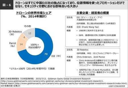 このドローンの世界市場は、2014年時点で約650億円にまで拡大しています。この市場シェアの70%を握り、独占しているのが中国のDJI です(図-6)。
