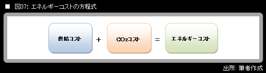 CO2が地球温暖化の原因であることが科学的に証明されている現在、CO2は社会にとってのコストですから、CO2を排出することへのペナルティー(つまりコスト)もエネルギーコストの要素として考慮しなければなりません。つまり、以下の方程式が成り立ちます(図37)。