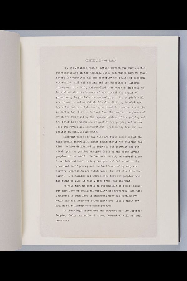 ところが松本案の内容は、天皇主権の明治憲法とあまり変わらないものだったので、マッカーサーは2月3日に民政局のケーディス次長に憲法草案をつくるよう命じた。25人のスタッフが大急ぎでGHQ草案(写真)を起草し、10日にマッカーサーに提出した。