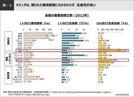 大前研一の特別講義「狭い日本はクオリティ型農業で勝負せよ」 biblion 著者フォロー フォロー中 2016.8.29(月) シェア10 Tweet 1 2 3 4 拡大画像表示 ギャラリーページへ 本コラムは「biblion」の提供記事です。 ギャラリーページへ 小さな農地面積で生産性を上げている 残り1950文字 ここからは、JBpress Premium 限定です。 会員ログイン JBpress Premiumを無料で試す 初月無料 税込550円/月 全記事読み放題! カンタン登録!続けて記事をお読みください。詳細はこちら Premium会員に人気の記事 【自民党総裁選】小泉純一郎はルール変更追い風に初勝利、強者・権力者が「ゴールポスト」を動かした歴史 参政党の演説に在日コリアン3世の私が共感してしまった理由 AIが「働きたくても働けない人」と「働かなくてもいい人」を生成し始めた シェア10 Tweet あわせてお読みください 大前研一の特別講義「日本がクオリティ農業国オランダに学べること」 biblion アマゾン、ついに本格的な音楽ストリーミング開始か 競合サービスの半額プランも準備中 小久保 重信 レールガンは役立たず?米国ですでに失敗作の烙印 兵器にロマンはいらない、日本も現実的な技術開発を 部谷 直亮 地球の未来をかけた科学者たちの挑戦 「超学際」と社会のトランスフォーメーションに向けて 矢原 徹一 やっていいのか?生命の操作が作り出す新たな生物 HONZ特選本『サイボーグ化する動物たち』 HONZ 本日の新着 一覧 【高齢者連れ去り・江東区②】任意同行した警察署から消え、区側は一切の面会を拒否…虐待ないのに、なぜ? フロントラインプレス | 西岡 千史 【ウナギの闇】ハイチでは麻薬ビジネスのマネーロンダリングに利用も、資源管理には大消費国・日本の責任が大きい ワシントン条約の規制は免れたが、求められる厳格管理と資源回復に向けた方策 志田 富雄 【原油ウォッチ】ウクライナの水上ドローンがロシアのタンカー攻撃、それでも「供給過剰」懸念で価格急落は近い? 藤 和彦 香港高層マンション火災、背後に親中派の汚職か…浮上する人災説、竹の足場より疑わしい中国化した香港の闇 はやくも言論弾圧、当局による原因究明を多くの市民は信じていない 福島 香織 マーケティング道場 バックナンバー 一覧 点は後で繋ぐ、イノベーションマネジメントの秘訣 松岡 智代/矢野 勝治 「両利き」の発想で既存企業もイノベーターへ 松岡 智代/矢野 勝治 JVCケンウッドが社外との共創で成果を出せた理由 松岡 智代/矢野 勝治 普及はまだ先? 1万人調査でみるサブスク消費 三矢 正浩 BtoBマーケターは「共感」で組織を変える 森川 直樹 「断捨離」はなぜ平成の女性に受け入れられたのか 三矢 正浩 フォロー機能について フォロー機能とは、指定した著者の新着記事の通知を受け取れる機能です。 フォローした著者の新着記事があるとヘッダー(ページ上部)のフォロー記事アイコンに赤丸で通知されます。 フォローした著者の一覧はマイページで確認できます。 ※フォロー機能は無料会員と有料会員の方のみ使用可能な機能です。 設定方法 記事ページのタイトル下にある「フォローする」アイコンをクリックするとその記事の著者をフォローできます。 確認方法 フォロー中の著者を確認したい場合、ヘッダーのマイページアイコンからマイページを開くことで確認できます。 解除方法 フォローを解除する際は、マイページのフォロー中の著者一覧から「フォロー中」アイコンをクリック、または解除したい著者の記事を開き、タイトル下にある「フォロー中」アイコンをクリックすることで解除できます。 ご登録 ログイン