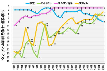 まず、メモリメーカー4社の半導体売上高世界ランキングの推移をみてみよう(図1)。