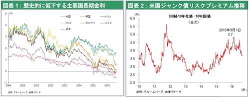 Brexitを契機に英ポンド金利が急低下したことにより先進国でまともな長期金利がついているのは米国だけとなった(図表1)。その米国でも景気堅調にもかかわらず海外からの資金流入により金利低下圧力がかかっている。危険視されてきたジャンク債や新興国債などにも、しびれを切らした資金が流入し利回りは大きく低下している(図表2)。まさに空前の余剰資金がイールド(利回り)を求めて世界中を徘徊しているのである。