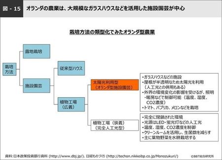 栽培方法は主に、露地栽培と施設園芸に大きく分けられます。施設園芸には日本で行われているような従来型ハウス と、植物工場があります。さらに植物工場は、太陽光を利用したものと、完全に人工光で栽培するものと、2通りに分けられます。