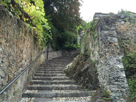 湖畔のアスコナの街からモンテ・ヴェリタへと続く小道には、ツタが垂れた古い石塀の間に、曲がりくねった石段が続いている。登りに一息ついて坂道を振り返れば、マッジョーレ湖畔の美しい街並みを展望できる(冒頭の写真)。まるでジブリの映画に登場しそうな風景である。