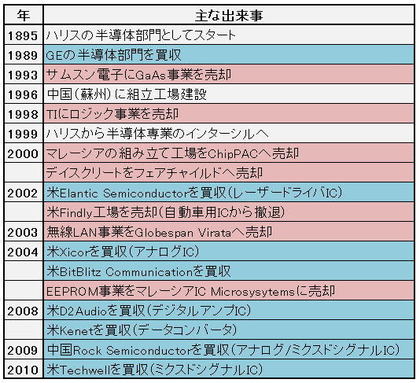 ハリスの半導体部門から出発し、今日に至るまでのインターシルの主な出来事を表1に示す。その歴史は、買収と売却に彩られていると言える。