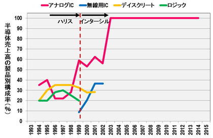 では、買収と売却を繰り返して、インターシルはどのような企業になろうとしたのか? 図1に、ハリスおよびインターシルの半導体売上高における製品別構成比率を示す。