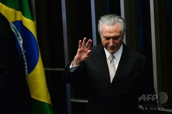 President Michel Temer waves as he takes office before the plenary of the Brazilian Senate in Brasilia, on August 31, 2016. (c)AFP/ANDRESSA ANHOLETE