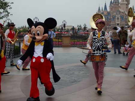 メインエントランスを抜けると、目の前にマーチングバンドが現れた。バンドと一緒に行進するミッキーマウスを中国人の観衆が取り囲む。「前に出ないでください」と制するキャスト(スタッフ)を無視して、好き勝手に写真を撮り始めた。