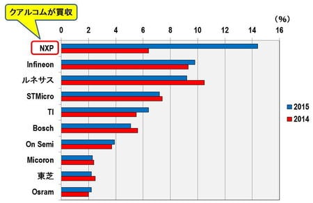 一方、NXPは、エレクトロニクスメーカーのフリップスの半導体部門が独立した垂直統合型(IDM)の半導体メーカーで、車載用や認証端末用等の半導体が主力であり、2015年に旧モトローラの米フリースケール・セミコンダクタを買収し、世界半導体売上高では7位、車載半導体ではルネサスや独インフィニオンを抜いて売上高1位となっている。