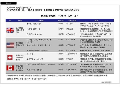 イギリスでは、ボーディング・スクールがその役割を担っています(図-7)。400~500年以上の歴史を持つ、全寮制の寄宿学校です。学費が高く、主に裕福な家庭の子供たちが入学し、集団生活を送っています。