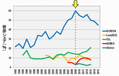 その洗浄装置を供給している世界トップシェアのメーカーは、「SCREENセミコンダクターソリューションズ」(京都市上京区、以下「スクリーン」)である。ところが、そのスクリーンのシェアが2009年に60%でピークアウトし、2015年には45%を切ってしまった。(図1)。