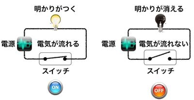 電球、電線、電源、そしてスイッチで構成される電気回路を考えます。スイッチが1つの場合にはオンとオフの組合せしかない最も単純な回路です(図)。