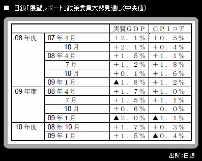 景気の回復時期として日銀が今回想定したのは、「2009年度後半以降」(昨年10月時点では「2009年度半ば以降」)。ただし、「このような見通しを巡る不確実性は高い」と明記することで、そうした中心的な見通しには日銀としても自信を持ちにくいことを、同時に示唆した。