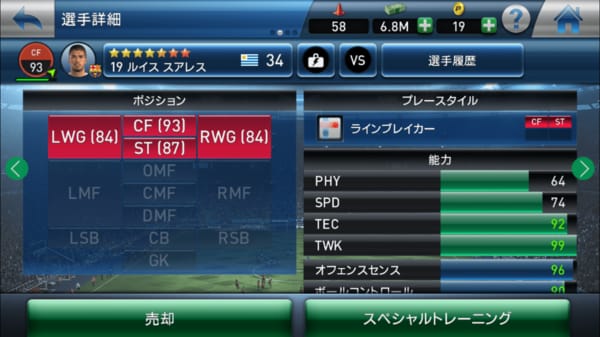 それぞれの円形のアイコンから選手名をタップすると、各選手のステータスを個別に見ることができる。カッコ内の数字が各ポジションに配置した時の適正値なので、例えばルイス スアレス選手の場合、CF(センターフォワード)に配置するのが最適で、ST(セカンドトップ)やLWG(レフトウイング)、RWG(ライトウイング)に入れてもそれなりに高いパフォーマンスを出せることがわかる。グレーアウトしたポジションでは活躍できないため、「ルイス スアレスならOMF(オフェンシブミッドフィルダー)でもいけるだろう」と勝手に判断するのはよろしくない。