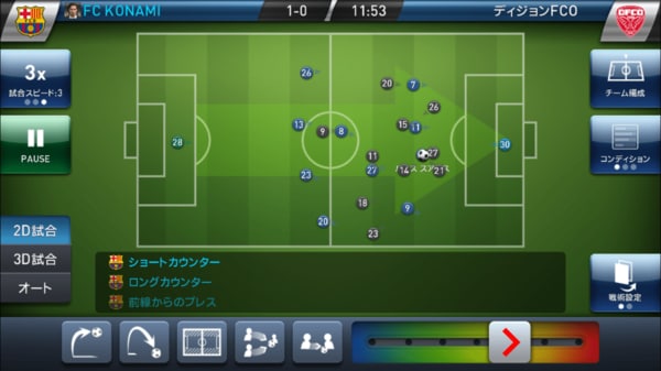 試合中もリアルタイムで指示を出すことができる。左下に並ぶ5つのアイコンから、「攻撃タイプ(ポゼッション/カウンター)」「ビルドアップ(ショートパス/ロングパス)」「攻撃エリア(中央/サイド)」「守備タイプ(フォアチェック/リトリート)」「プレッシング(アグレッシブ/セーフティ)」を選択したり、7段階で攻守レベルを設定したりすることが可能。そのほかにも、戦局や残り時間を見て、控えの選手と入れ替えるなど、適宜調整をしながら、チームを勝利へと導こう。
