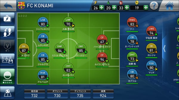 試合前に表示されるのが、この「チーム編成」画面だ。フィールドの中に入っている円形のアイコンがスタメンであり、枠外にいるのは控えの選手である。この円形のアイコンをドラッグアンドドロップすることで、選手の入れ替えができる。