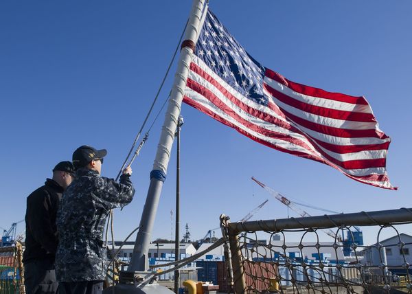 ミサイル駆逐艦「ジョン・S・マケイン」に星条旗を掲揚する乗組員。米海軍横須賀基地にて(資料写真、出所:米海軍)