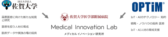 メディカル・イノベーション研究所では、佐賀大学医学部の医学的知見、佐賀大学医学部付属病院の臨床データと実践の場、オプティムのIoT・AI技術を組み合わせ、医療現場の課題に対して効率的かつ効果的な医療を実施するための研究を実施していく。