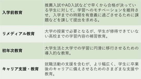 現在、大衆化した日本の大学が提供している教育や学生支援の中には、かつて(大雑把に言えば、1990年代まで)の大学にはほとんど存在しなかったメニューがある。その代表的なものを挙げると、以下の表のようなラインナップになる。